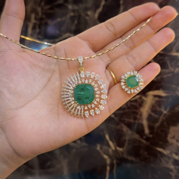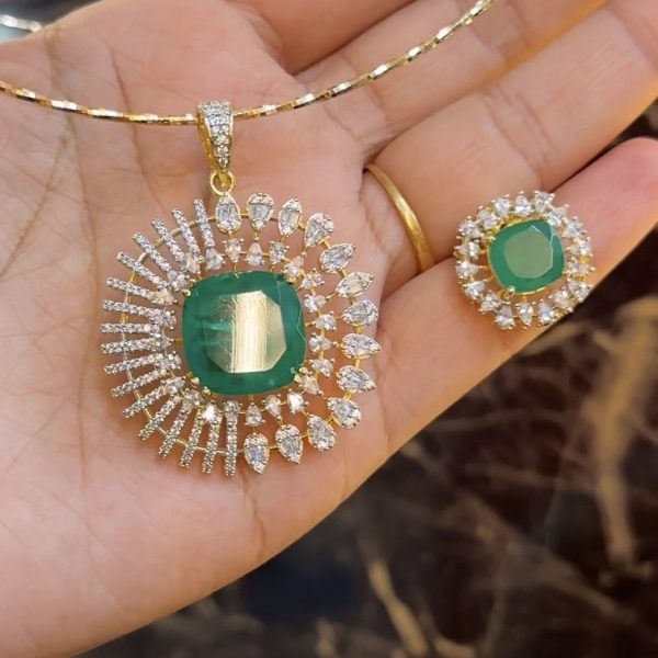 The pendant is paired with a matching earring that mirrors the same central green stone encircled with AD stones, ensuring a perfect coordinated look.