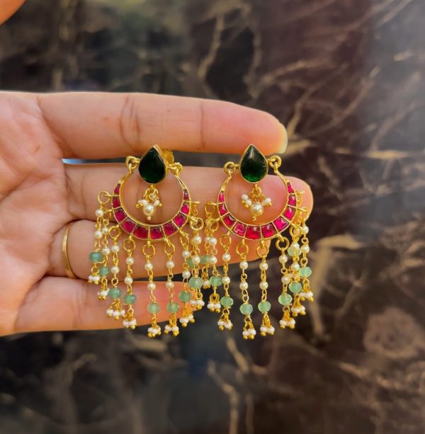 From the crescent base, multiple dangling chains of pearls and light green beads cascade down, creating a rich and festive chandelier effect.